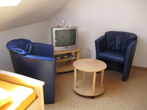 Das gemütliche und einladende Wohnzimmer ist mit einer Stereoanlage und einem Fernseher (SAT-TV) ausgestattet. Eine kleine Auswahl an Büchern ist auch vorhanden. Ein weiterer Fernseher und CD-Player befindet sich in einem der beiden Schlafzimmer mit Einzelbetten.